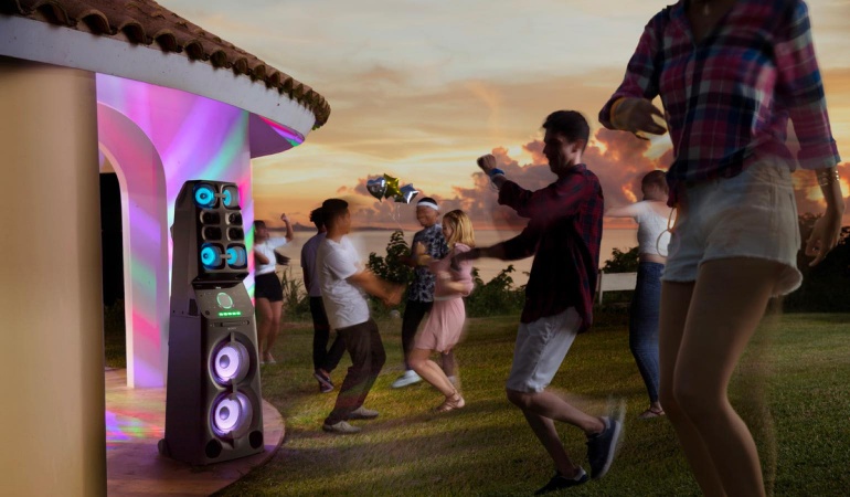 Sony V90DW MUTEKI در واقع یک سیستم صوتی همه کاره برای کسانی است که دوست دارند مهمانی داشته باشند. این یک سیستم کوچک نیست ؛ وزن آن کمی زیاد است و 170 سانتی متر ارتفاع دارد ، اما خوشبختانه به لطف چرخ ها می توانید هیولا را به راحتی حرکت دهید. همه چیز در مورد Sony V90DW MUTEKI همه چیز در مورد صدا و نور است. با چهار بلندگو ، چهار جهت دهنده صدای متوسط ، دو ووفر و در پشت دو نوار LED که می تواند جلوه های دیسکو را به دیوار پشت ارائه دهد. جلو همچنین مجهز به نور LED است.